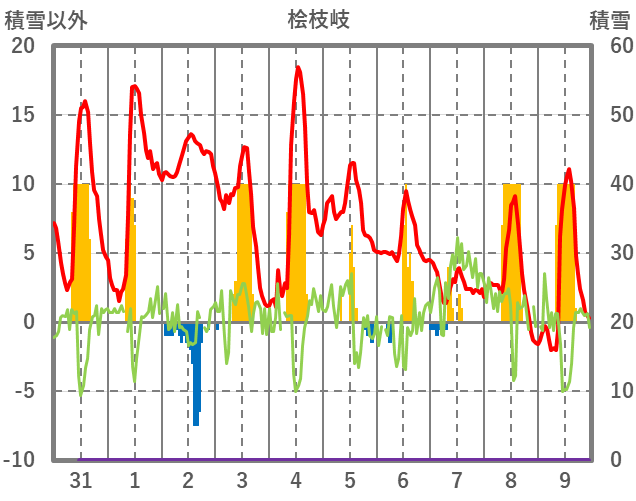 | 日 | 時 | 気温 | 降水 | 風向/風速 | 日照 | 積雪 | 降雪 |