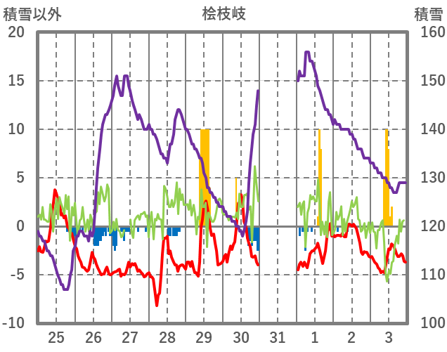 | 日 | 時 | 気温 | 降水 | 風向/風速 | 日照 | 積雪 | 降雪 |