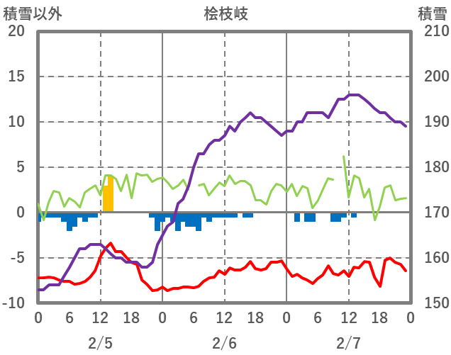 | 日 | 時 | 気温 | 降水 | 風向/風速 | 日照 | 積雪 | 降雪 |