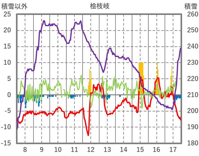 | 日 | 時 | 気温 | 降水 | 風向/風速 | 日照 | 積雪 | 降雪 |