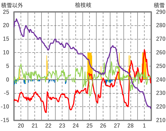 | 日 | 時 | 気温 | 降水 | 風向/風速 | 日照 | 積雪 | 降雪 |
