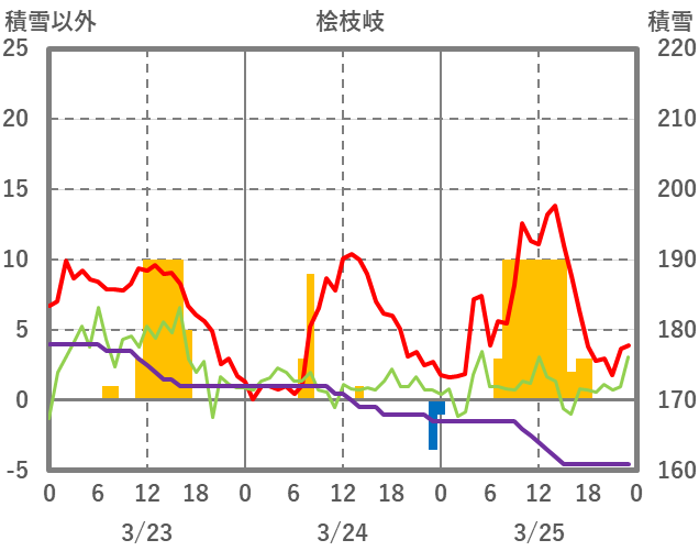 | 日 | 時 | 気温 | 降水 | 風向/風速 | 日照 | 積雪 | 降雪 |