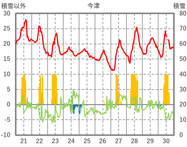 | 日 | 時 | 気温 | 降水 | 風向/風速 | 日照 | 積雪 | 降雪 |