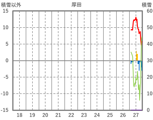 | 日 | 時 | 気温 | 降水 | 風向/風速 | 日照 | 積雪 | 降雪 |