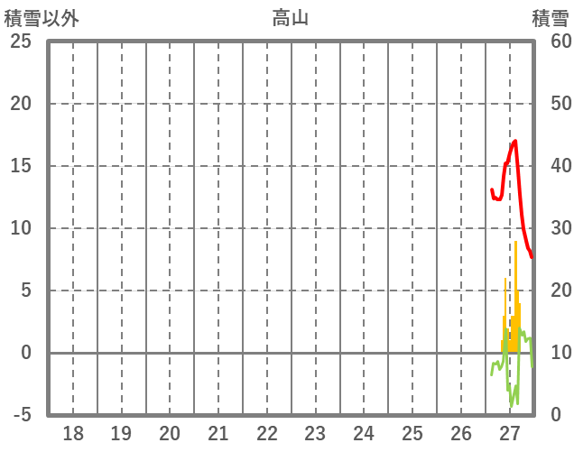 | 日 | 時 | 気温 | 降水 | 風向/風速 | 日照 | 積雪 | 降雪 |