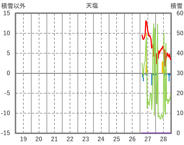 | 日 | 時 | 気温 | 降水 | 風向/風速 | 日照 | 積雪 | 降雪 |