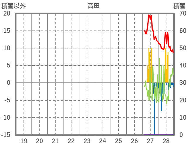| 日 | 時 | 気温 | 降水 | 風向/風速 | 日照 | 積雪 | 降雪 |