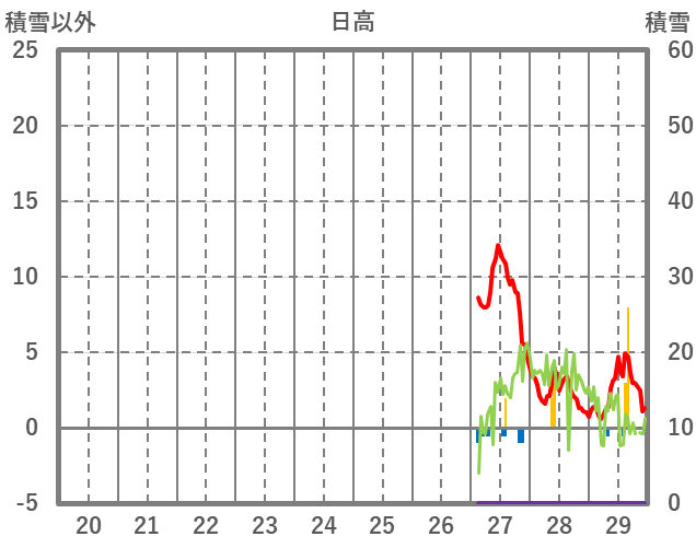 | 日 | 時 | 気温 | 降水 | 風向/風速 | 日照 | 積雪 | 降雪 |