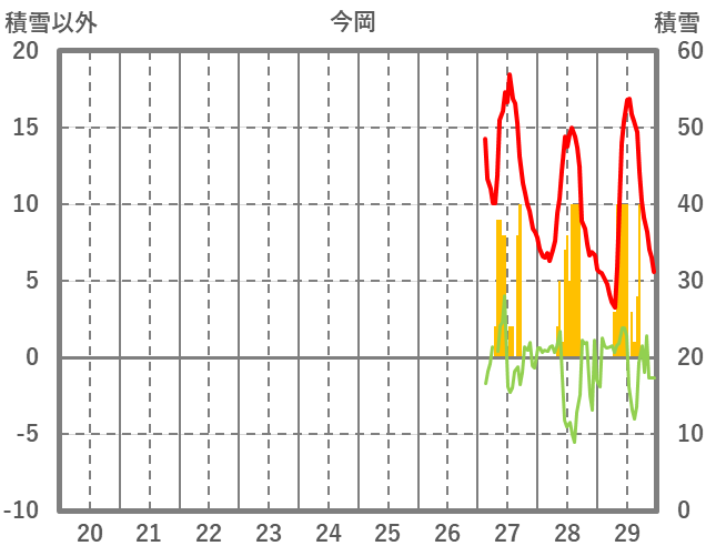 | 日 | 時 | 気温 | 降水 | 風向/風速 | 日照 | 積雪 | 降雪 |
