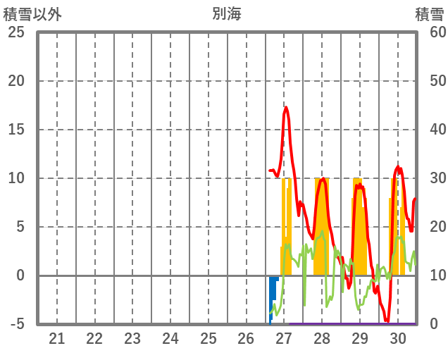 | 日 | 時 | 気温 | 降水 | 風向/風速 | 日照 | 積雪 | 降雪 |