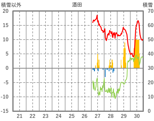 | 日 | 時 | 気温 | 降水 | 風向/風速 | 日照 | 積雪 | 降雪 |