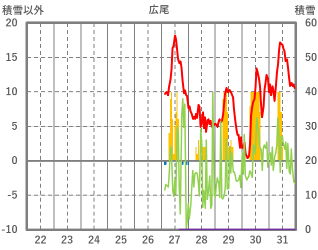 | 日 | 時 | 気温 | 降水 | 風向/風速 | 日照 | 積雪 | 降雪 |