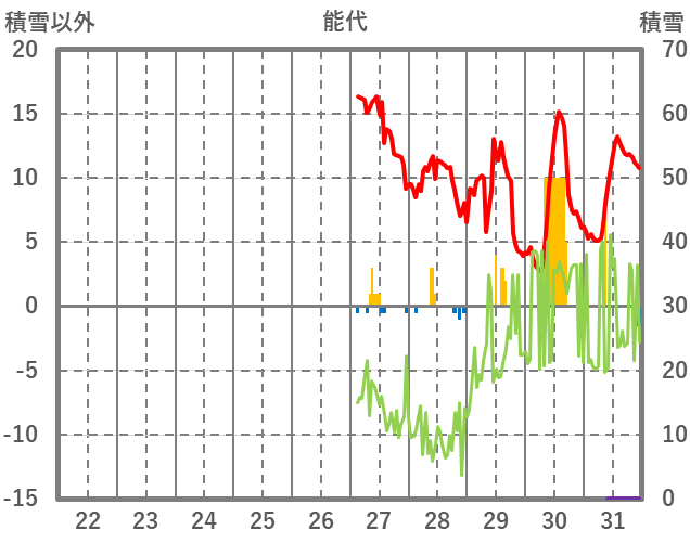| 日 | 時 | 気温 | 降水 | 風向/風速 | 日照 | 積雪 | 降雪 |