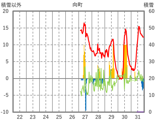| 日 | 時 | 気温 | 降水 | 風向/風速 | 日照 | 積雪 | 降雪 |