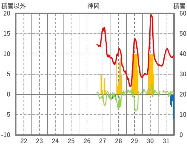 | 日 | 時 | 気温 | 降水 | 風向/風速 | 日照 | 積雪 | 降雪 |