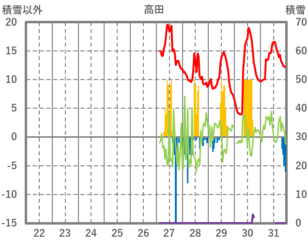 | 日 | 時 | 気温 | 降水 | 風向/風速 | 日照 | 積雪 | 降雪 |