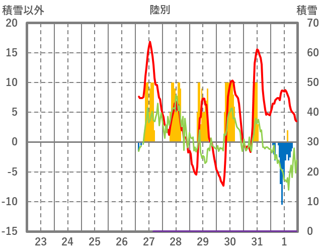 | 日 | 時 | 気温 | 降水 | 風向/風速 | 日照 | 積雪 | 降雪 |