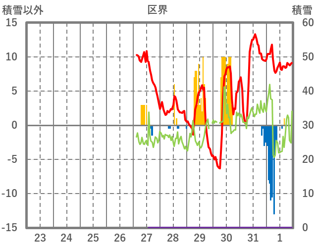 | 日 | 時 | 気温 | 降水 | 風向/風速 | 日照 | 積雪 | 降雪 |