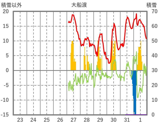 | 日 | 時 | 気温 | 降水 | 風向/風速 | 日照 | 積雪 | 降雪 |