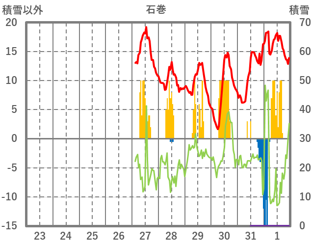 | 日 | 時 | 気温 | 降水 | 風向/風速 | 日照 | 積雪 | 降雪 |