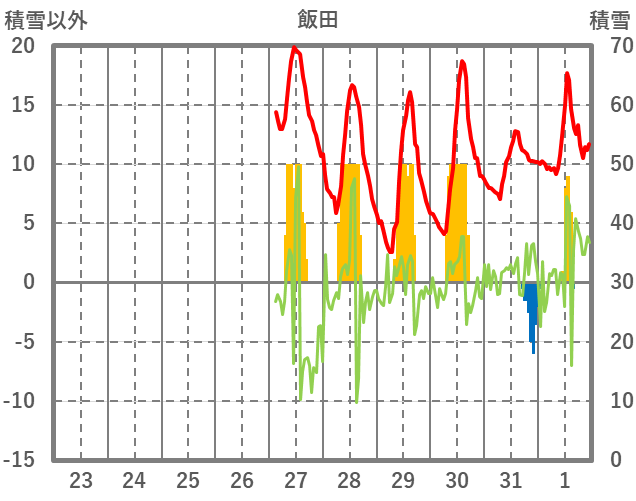 | 日 | 時 | 気温 | 降水 | 風向/風速 | 日照 | 積雪 | 降雪 |