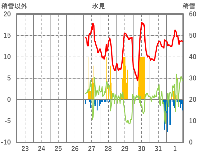 | 日 | 時 | 気温 | 降水 | 風向/風速 | 日照 | 積雪 | 降雪 |
