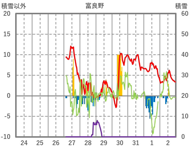| 日 | 時 | 気温 | 降水 | 風向/風速 | 日照 | 積雪 | 降雪 |