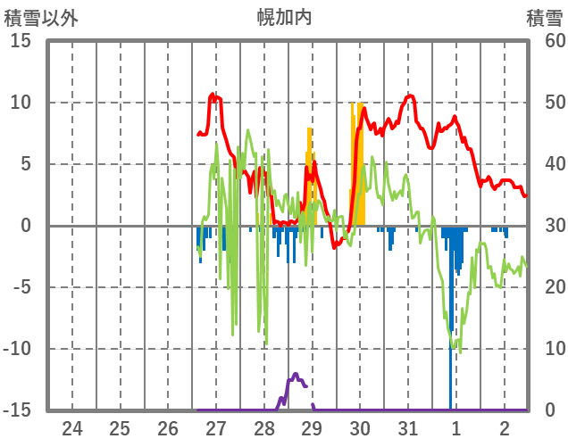 | 日 | 時 | 気温 | 降水 | 風向/風速 | 日照 | 積雪 | 降雪 |