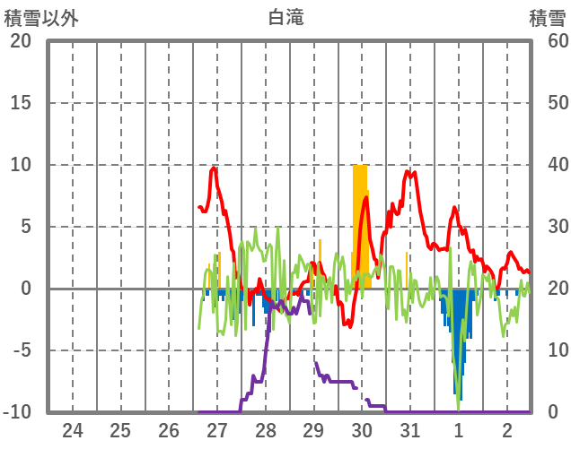 | 日 | 時 | 気温 | 降水 | 風向/風速 | 日照 | 積雪 | 降雪 |