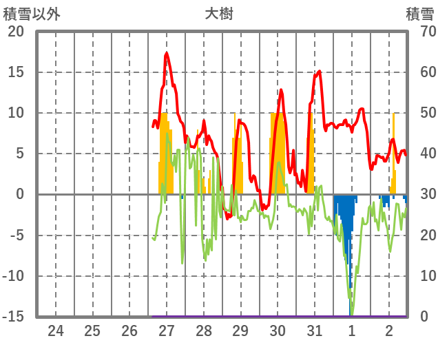 | 日 | 時 | 気温 | 降水 | 風向/風速 | 日照 | 積雪 | 降雪 |