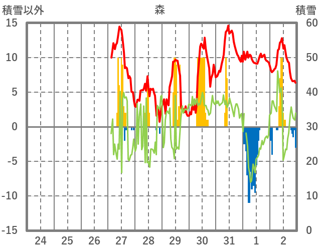 | 日 | 時 | 気温 | 降水 | 風向/風速 | 日照 | 積雪 | 降雪 |
