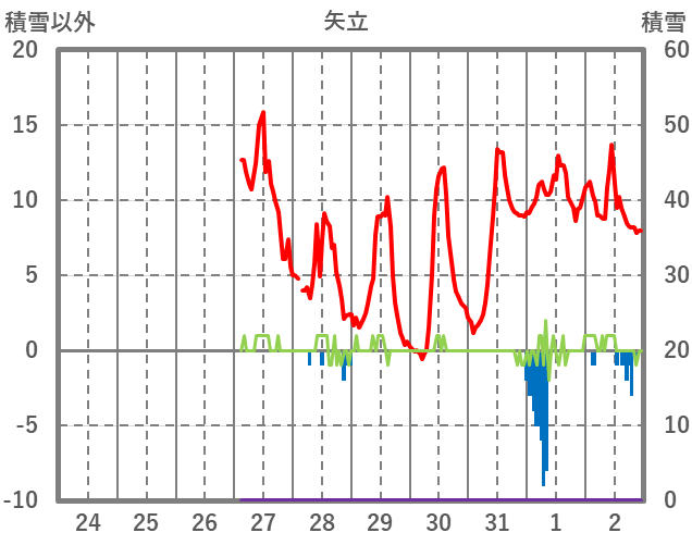 | 日 | 時 | 気温 | 降水 | 風向/風速 | 日照 | 積雪 | 降雪 |