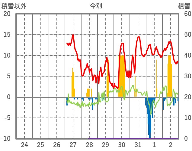 | 日 | 時 | 気温 | 降水 | 風向/風速 | 日照 | 積雪 | 降雪 |