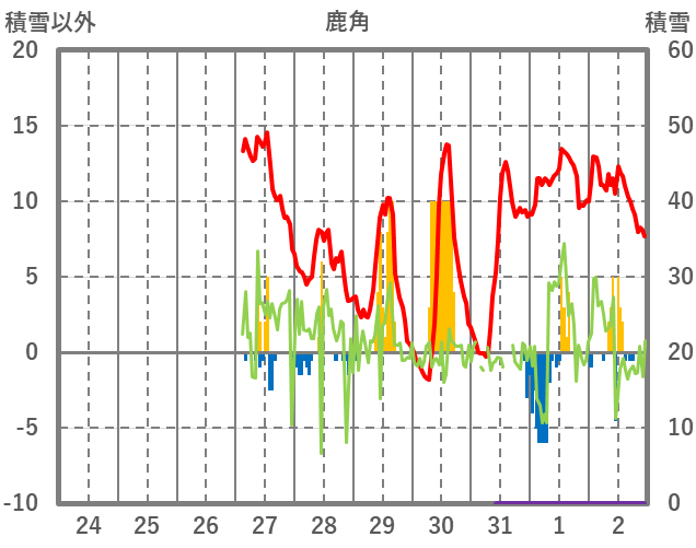 | 日 | 時 | 気温 | 降水 | 風向/風速 | 日照 | 積雪 | 降雪 |
