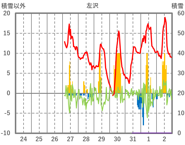 | 日 | 時 | 気温 | 降水 | 風向/風速 | 日照 | 積雪 | 降雪 |