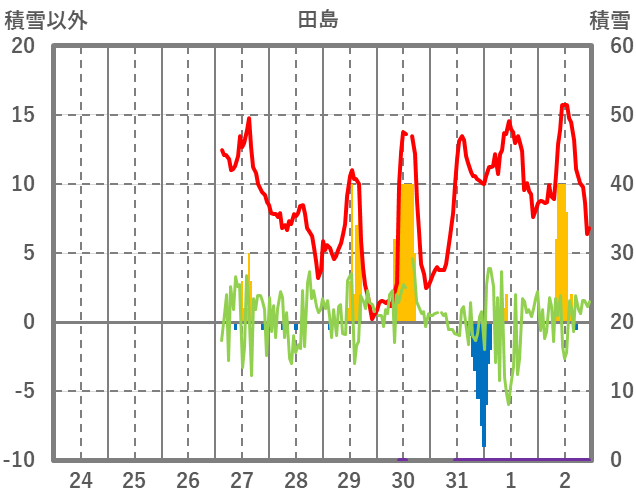 | 日 | 時 | 気温 | 降水 | 風向/風速 | 日照 | 積雪 | 降雪 |