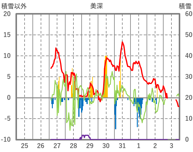 | 日 | 時 | 気温 | 降水 | 風向/風速 | 日照 | 積雪 | 降雪 |