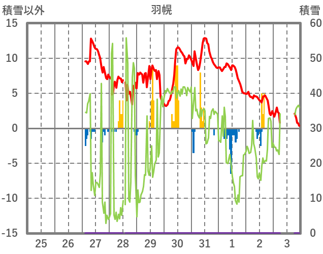 | 日 | 時 | 気温 | 降水 | 風向/風速 | 日照 | 積雪 | 降雪 |
