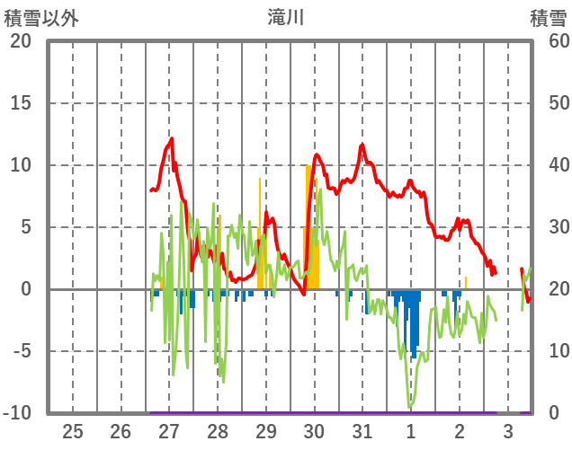 | 日 | 時 | 気温 | 降水 | 風向/風速 | 日照 | 積雪 | 降雪 |