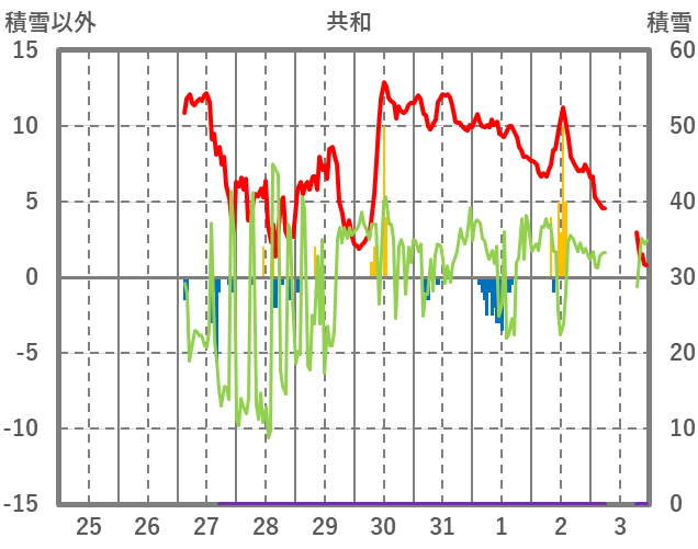 | 日 | 時 | 気温 | 降水 | 風向/風速 | 日照 | 積雪 | 降雪 |