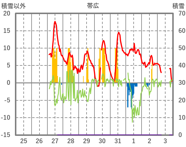 | 日 | 時 | 気温 | 降水 | 風向/風速 | 日照 | 積雪 | 降雪 |