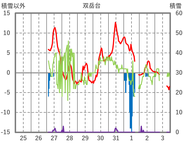 | 日 | 時 | 気温 | 降水 | 風向/風速 | 日照 | 積雪 | 降雪 |