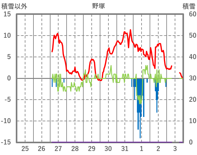 | 日 | 時 | 気温 | 降水 | 風向/風速 | 日照 | 積雪 | 降雪 |