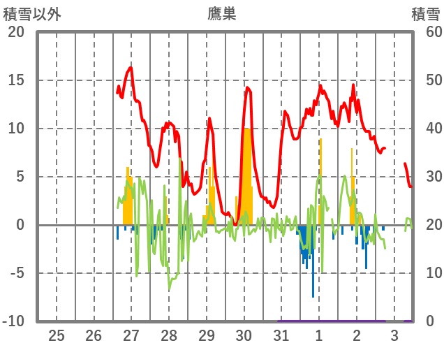 | 日 | 時 | 気温 | 降水 | 風向/風速 | 日照 | 積雪 | 降雪 |