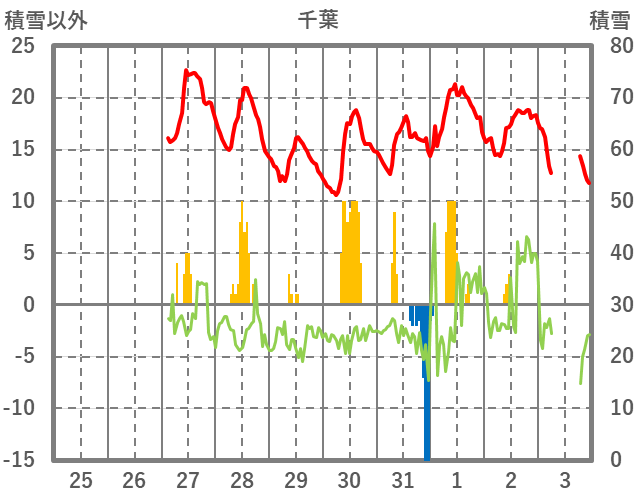 | 日 | 時 | 気温 | 降水 | 風向/風速 | 日照 | 積雪 | 降雪 |