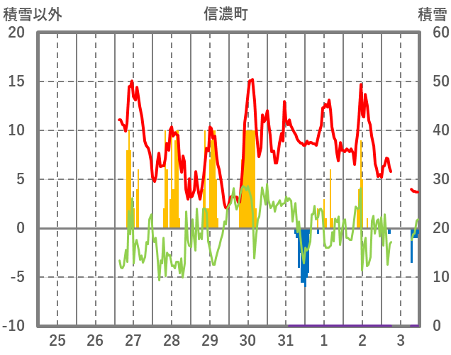 | 日 | 時 | 気温 | 降水 | 風向/風速 | 日照 | 積雪 | 降雪 |
