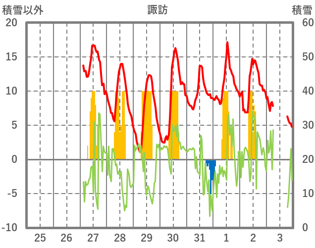 | 日 | 時 | 気温 | 降水 | 風向/風速 | 日照 | 積雪 | 降雪 |