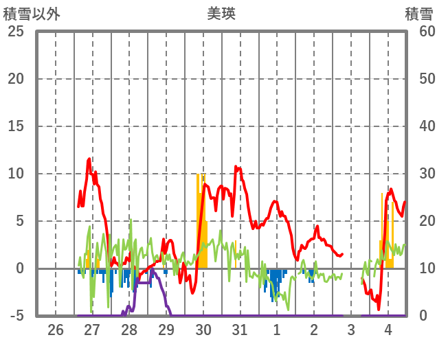 | 日 | 時 | 気温 | 降水 | 風向/風速 | 日照 | 積雪 | 降雪 |