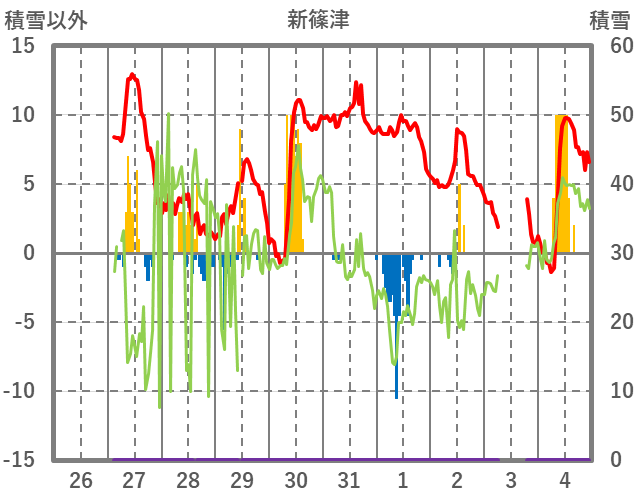 | 日 | 時 | 気温 | 降水 | 風向/風速 | 日照 | 積雪 | 降雪 |