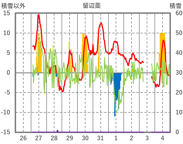 | 日 | 時 | 気温 | 降水 | 風向/風速 | 日照 | 積雪 | 降雪 |